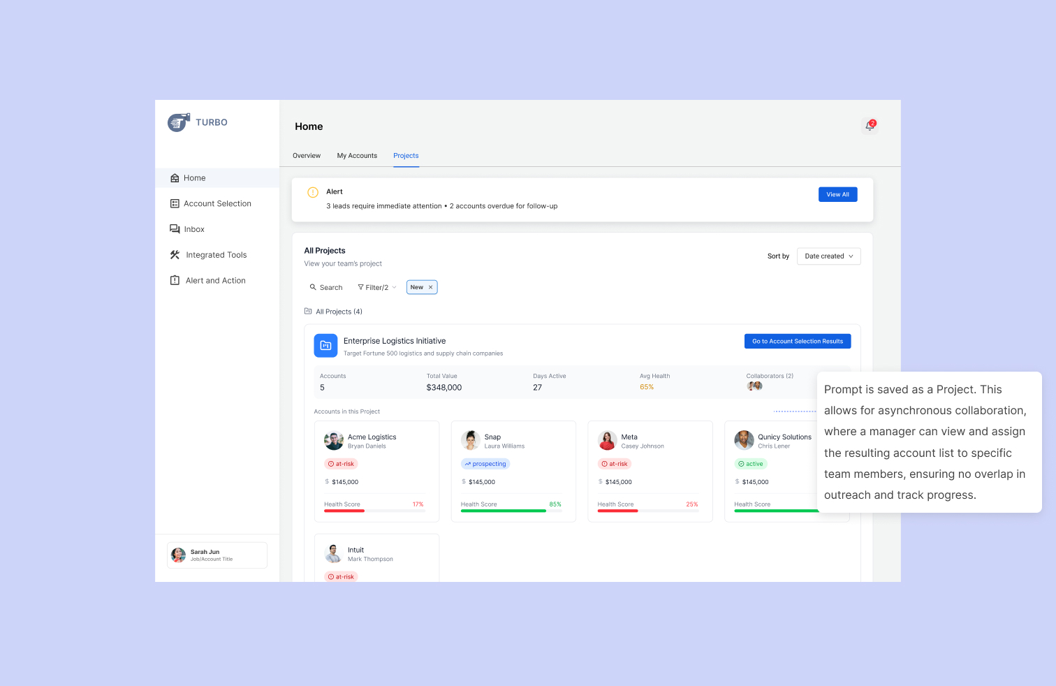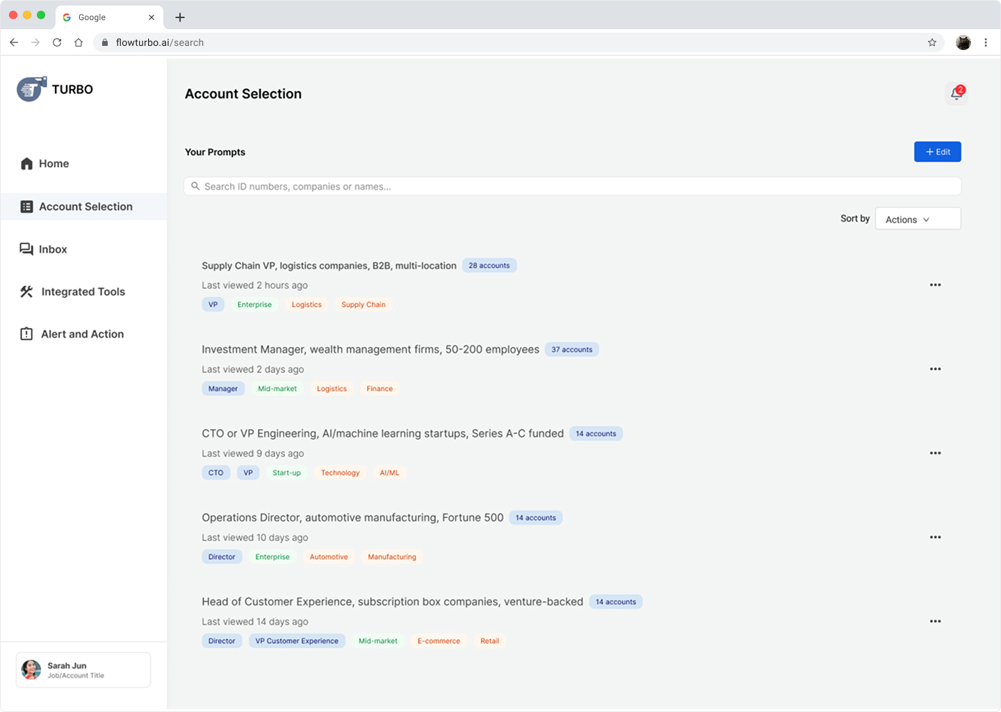 Flow AI is a company that is dedicated to develop tools that maximize sales reps' daily activity. Turbo is their lead source tool that use AI to present qualified accounts and streamline the customer acquisition process.