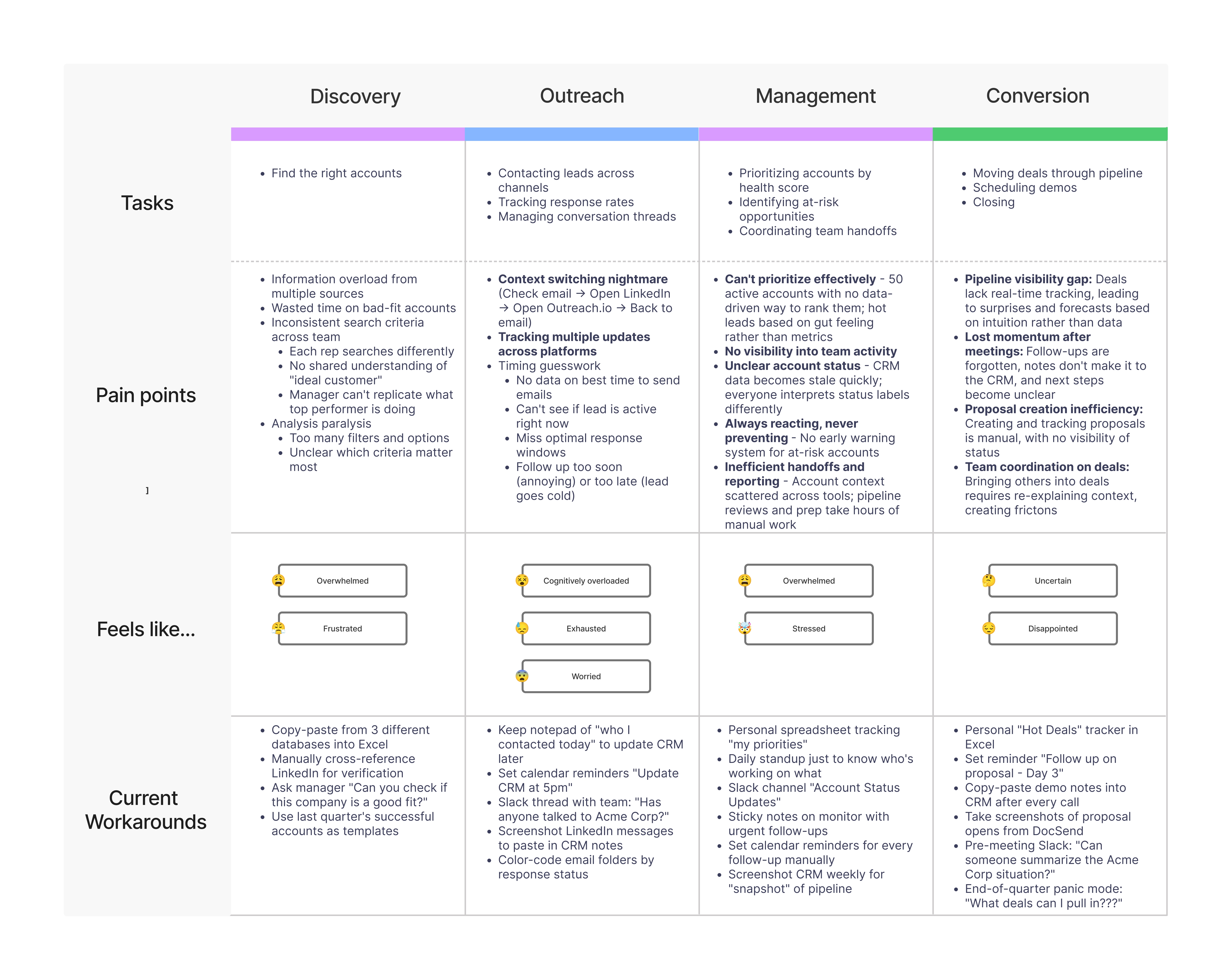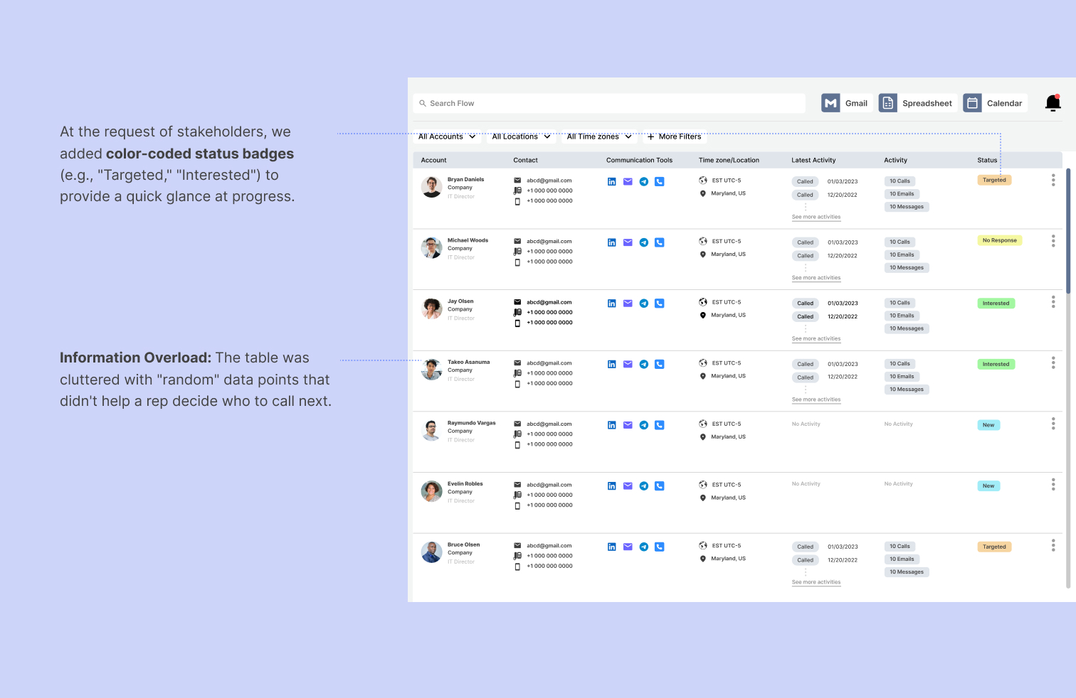 👎 However, user interviews revealed these statuses were often inaccurate because they required manual updates from the rep. Additionally, the individual account page created a "duct-taped" experience where users lost their place in the list every time they needed more information, significantly increasing interaction cost.
