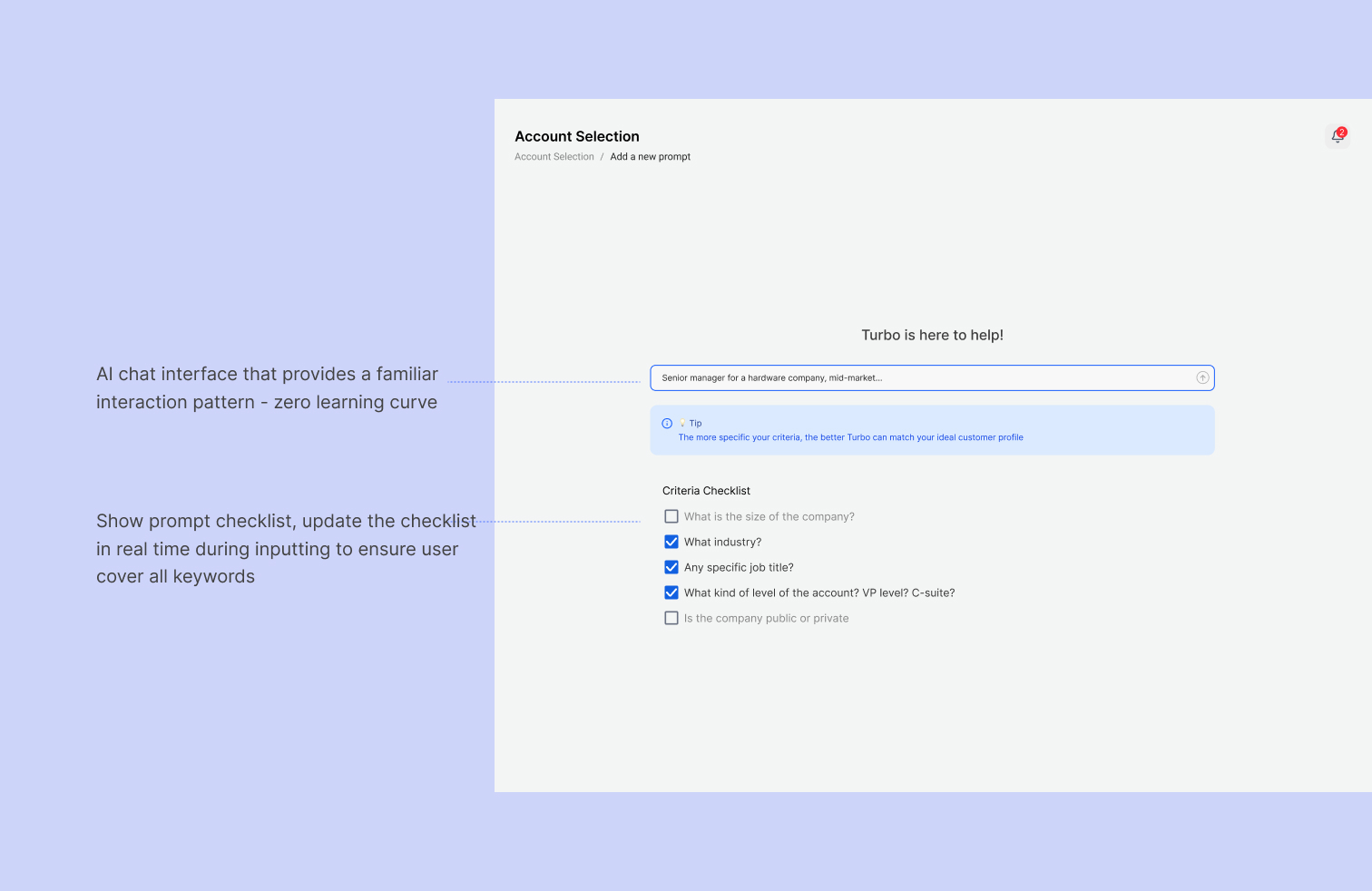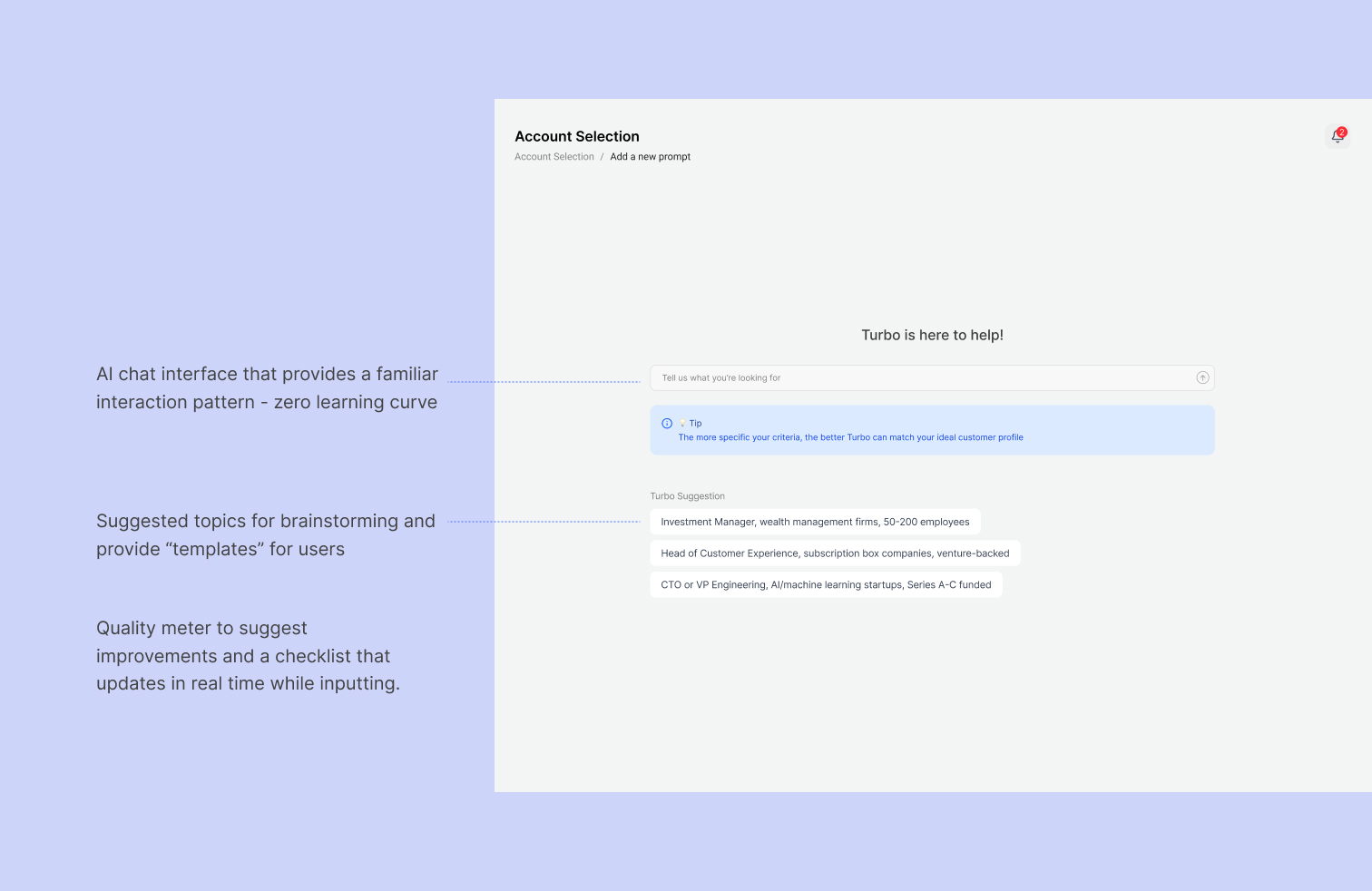 👎 After user testing, it showed that users felt 'blind'—they didn't know what the AI was capable of, leading to vague prompts and low-quality leads.