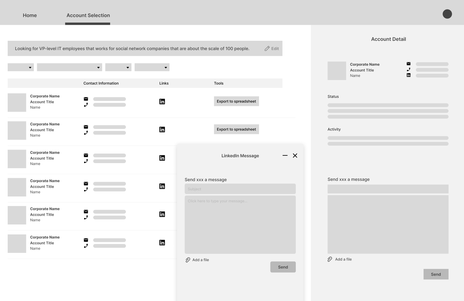Starting with AI Prompt, this is the primary touchpoint of the customer aqusition process. I My goal is to consolidating search criteria into an intelligent, guided workflow. In order to enable sales reps to bypass fragmented databases and move directly into high-intent relationship management.