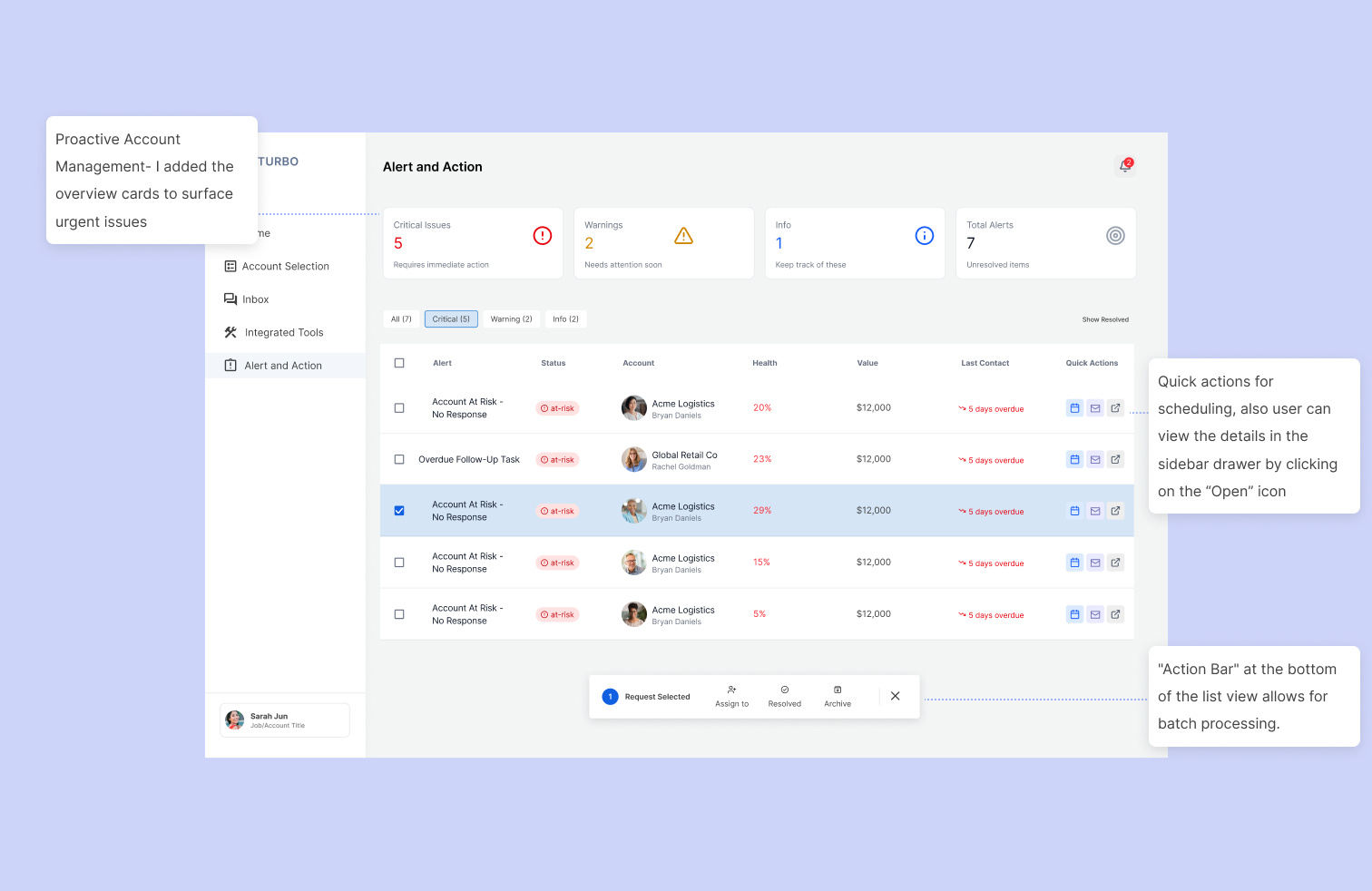 Progressive Disclosure: Only showing the most critical data points (like Health Score and Value) in the list view, while hiding technical details until an account is opened.Action-Oriented Design: Testing where "Quick Action" buttons (Email, Calendar, Chat) should live to ensure the "Time to Action" was as low as possible.Collaborative Context: Ensuring that team mentions and activity logs were integrated into the primary layout so reps wouldn't have to search through Slack or email to find account history.